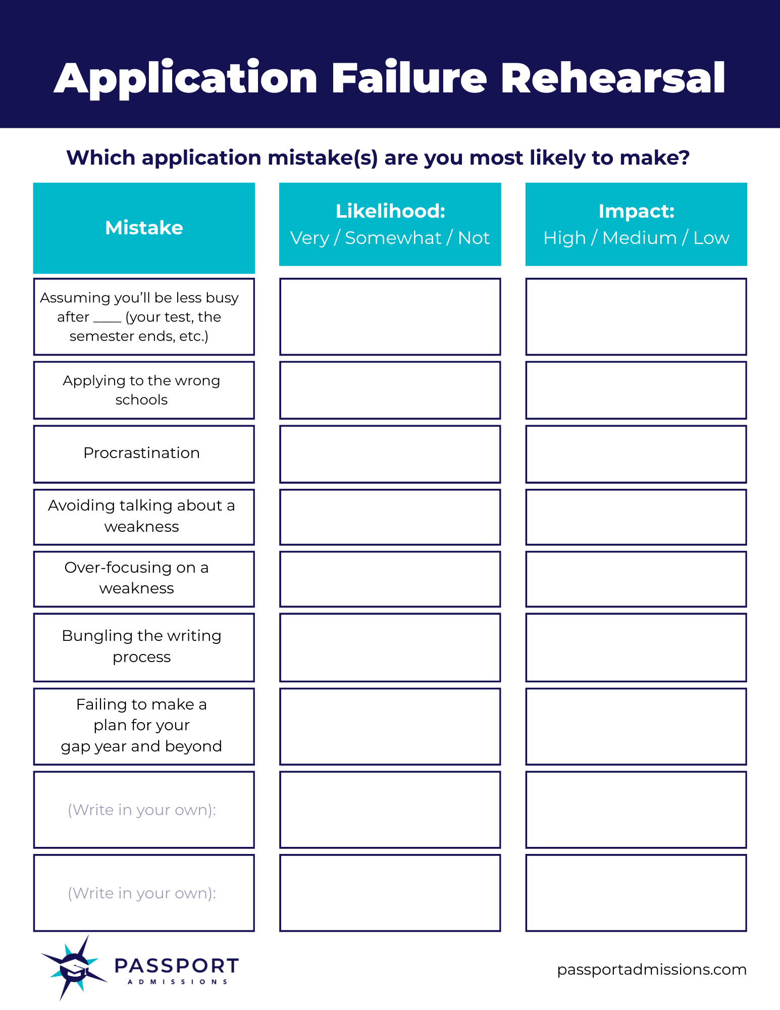 I’m writing today to double-down on my dose of realism by suggesting you imagine, in advance, how your application process might go wrong. Do a quick failure rehearsal for your application year, which involves considering negative outcomes and working backward to find ways to prevent them.